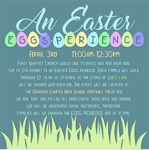 Mark your calendars for April 3rd as we will be having a new even️t in leiu of an Easter Egg Hunt called "An Easter Eggs-perience"! The FREE event is from 11:00am-12:30pm at the Grayson County High School football field. Each kid will recieve candy-filled eggs and a special treat at the very end. Hope to see you and your family there.